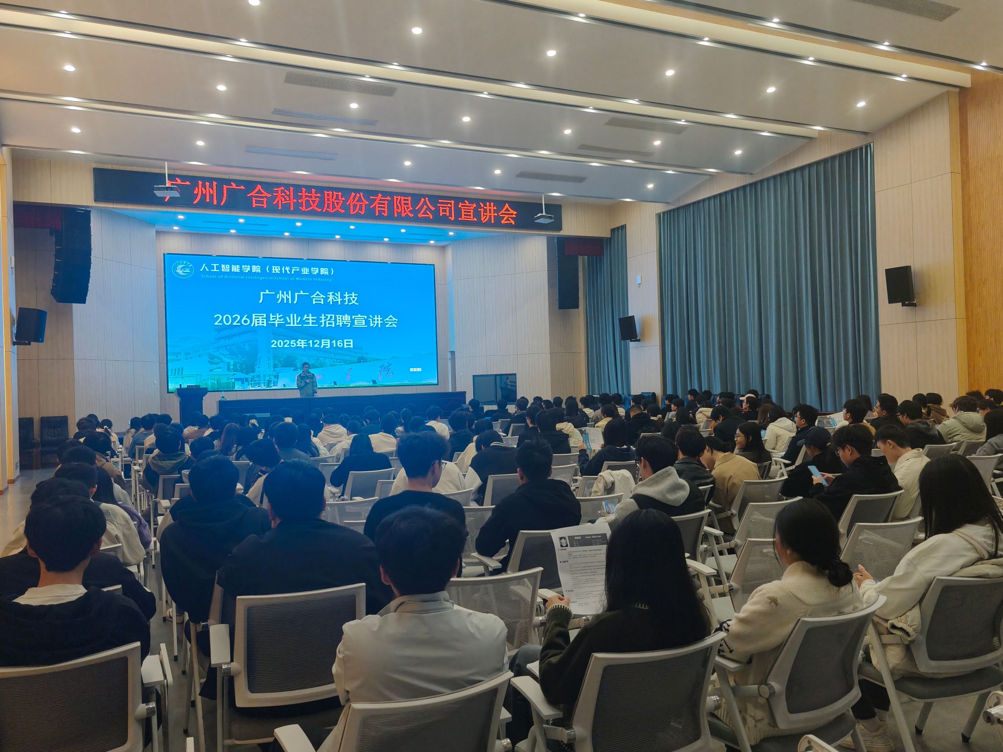 12月16日,广州广合科技股份有限公司在自强楼109报告厅举办2026届校招宣讲会,我院与建电学院、材化学院200余名在校毕业生参加。