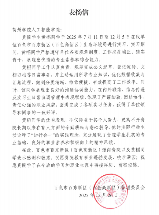 近日,我院收到来自百色市百东新区(百色高新区)管理委员会的表扬信,信中对我院2022级软件工程1班黄槄同学在该新区生态环境局的实习表现给予了高度评价与热烈表扬。